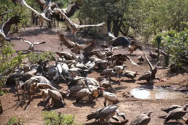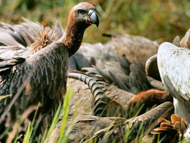 Die hässlichen rothaarigen Vögel sind Haubengeier, während es sich bei den anderen hauptsächlich um Weißrückengeier handelt.