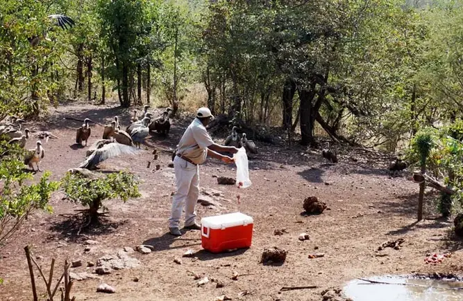 Dann schleppt der Geierführer einen Sack mit Köpfen, Füßen und Resten von Rindfleisch, Hühnern, Warzenschweinen – was der Koch nicht in der Küche der Lodge verwendet – zu einem roten Fleck.