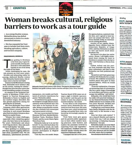 Mein Name ist Bishamba Juma und ich komme aus Mombasa, Kenia. Ich bin in Mombasa geboren, aufgewachsen und zur Schule gegangen und arbeite derzeit als Reiseleiterin.
