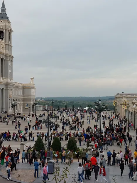 Ich werde neben der Zugangstreppe zur Almudena-Kathedrale an der Fassade vor dem Königspalast sein. Du erkennst mich an einer roten Tasche