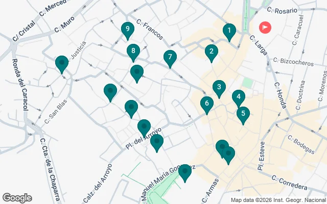 Unsere Tour endet auf der Plaza del Arenal , einem Platz, an dem sich einst eine riesige Maqbara oder ein Friedhof aus der andalusischen Zeit befand, die größere der beiden, die es dort gab. Wir erreichen sie über die wunderschöne Straße Pescadería , die von der Mauer begrenzt wird und sich in unmittelbarer Nähe der noch erhaltenen Überreste der alten Puerta del Real oder del Marmolejo befindet.