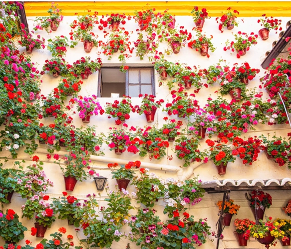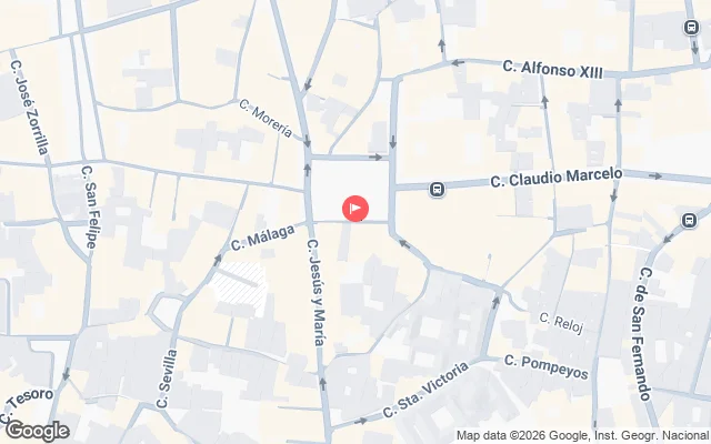 Sie finden mich neben dem Tendillas-Brunnen mit einer roten Blume mit Tupfen.