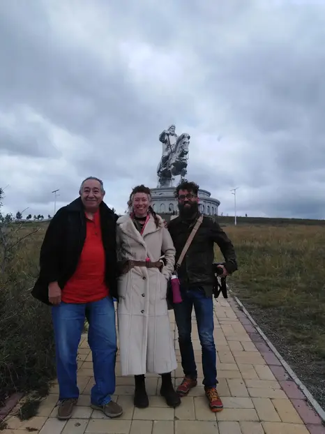 Ich werde direkt vor der Statue von Chinggis Khaan auf Sie warten. mit rotem T-Shirt oder Jacke