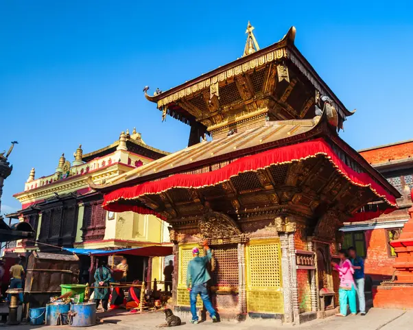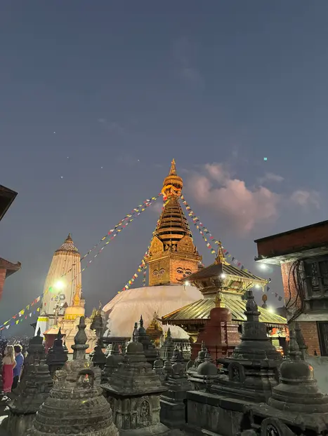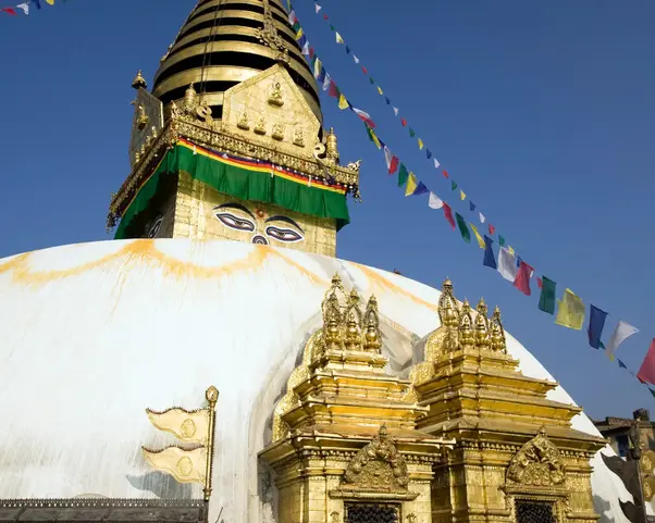 Der Swayambhunath -Komplex liegt auf einem Hügel westlich der Stadt Kathmandu und wird seit dem 5. Jahrhundert genutzt. Er besteht aus einem prächtigen Stupa mit Kuppel sowie einer Vielzahl von Schreinen und Tempeln. Jeder Tempel ist äußerst reich verziert und reich mit Gold und leuchtenden Gebetsfahnen geschmückt, obwohl es nicht nur die spirituelle Dekoration ist, die Besucher anzieht.