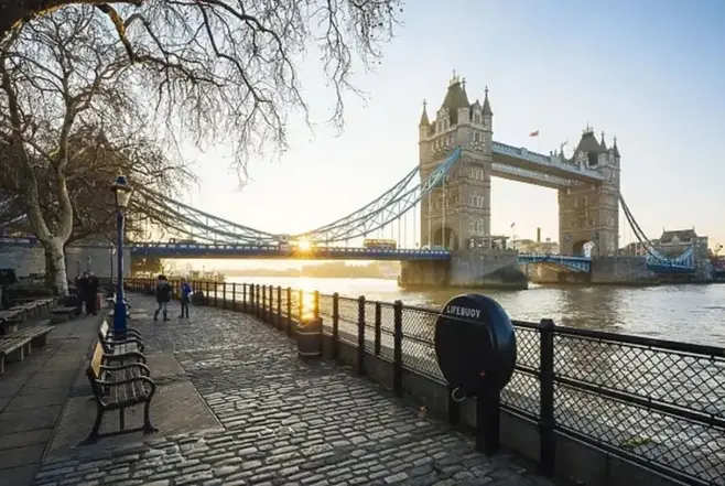 Unser Spaziergang führt uns weiter entlang der Themse, wo wir atemberaubende Panoramablicke auf einige der beliebtesten Sehenswürdigkeiten der Stadt genießen können, darunter die Tower Bridge, das ehemalige Rathaus, Londons symbolträchtigen Shard, das Kriegsschiff HM Belfast und die London Bridge, die sich bei Einbruch der Dunkelheit in ein Lichtermeer verwandelt.