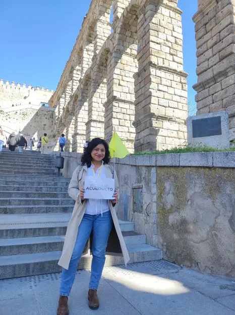 Estaré en las escaleras que hay junto a la Oficina de Turismo con el cartel de "Más Allá del acueducto"