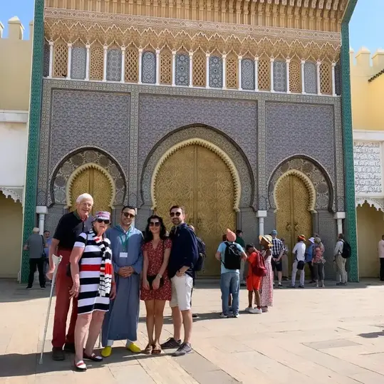 Begeben Sie sich auf einen fesselnden Rundgang durch Fez, Marokko. Beginnen Sie am berühmten Bab Bou Jeloud (Blaues Tor) und schlendern Sie durch die engen, lebhaften Straßen der Medina, die zum UNESCO-Weltkulturerbe gehört.