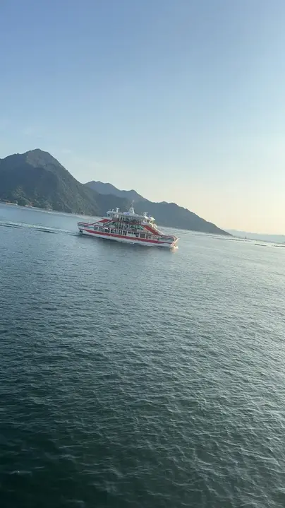 Ich werde vor dem Fährterminal von Miyajima stehen. Dort befinden sich zwei Säulen, und Sie werden mich in deren Nähe finden.