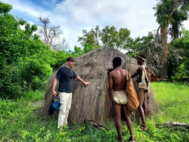 Zwei Buschmänner aus dem Dorf begleiten die Kunden, wir organisieren das für Sie. Während der Tour sind Sie mit einem Führer unterwegs, der zur Sicherheit Pellets, eine Waffe und eine Lizenz hat.
