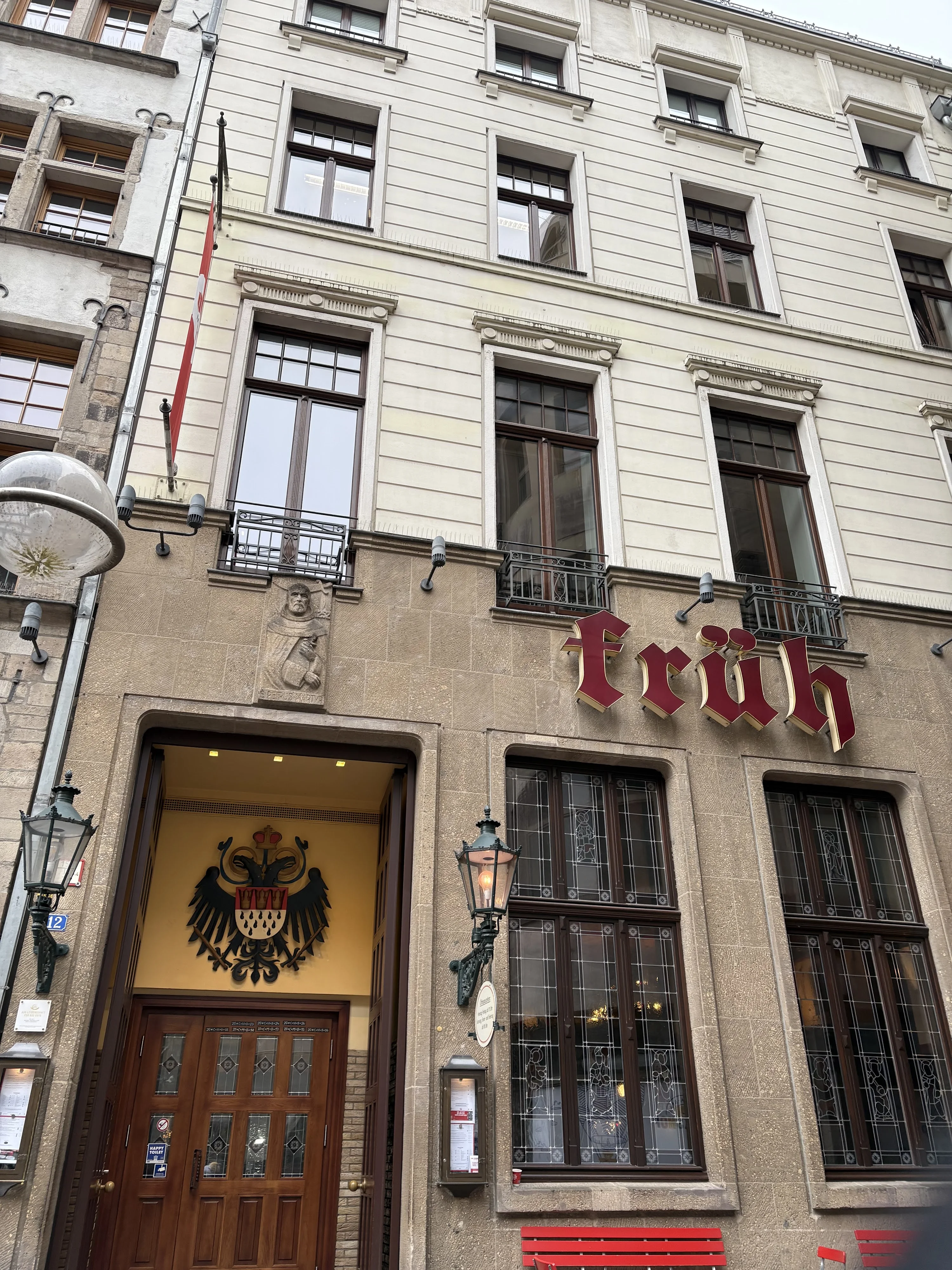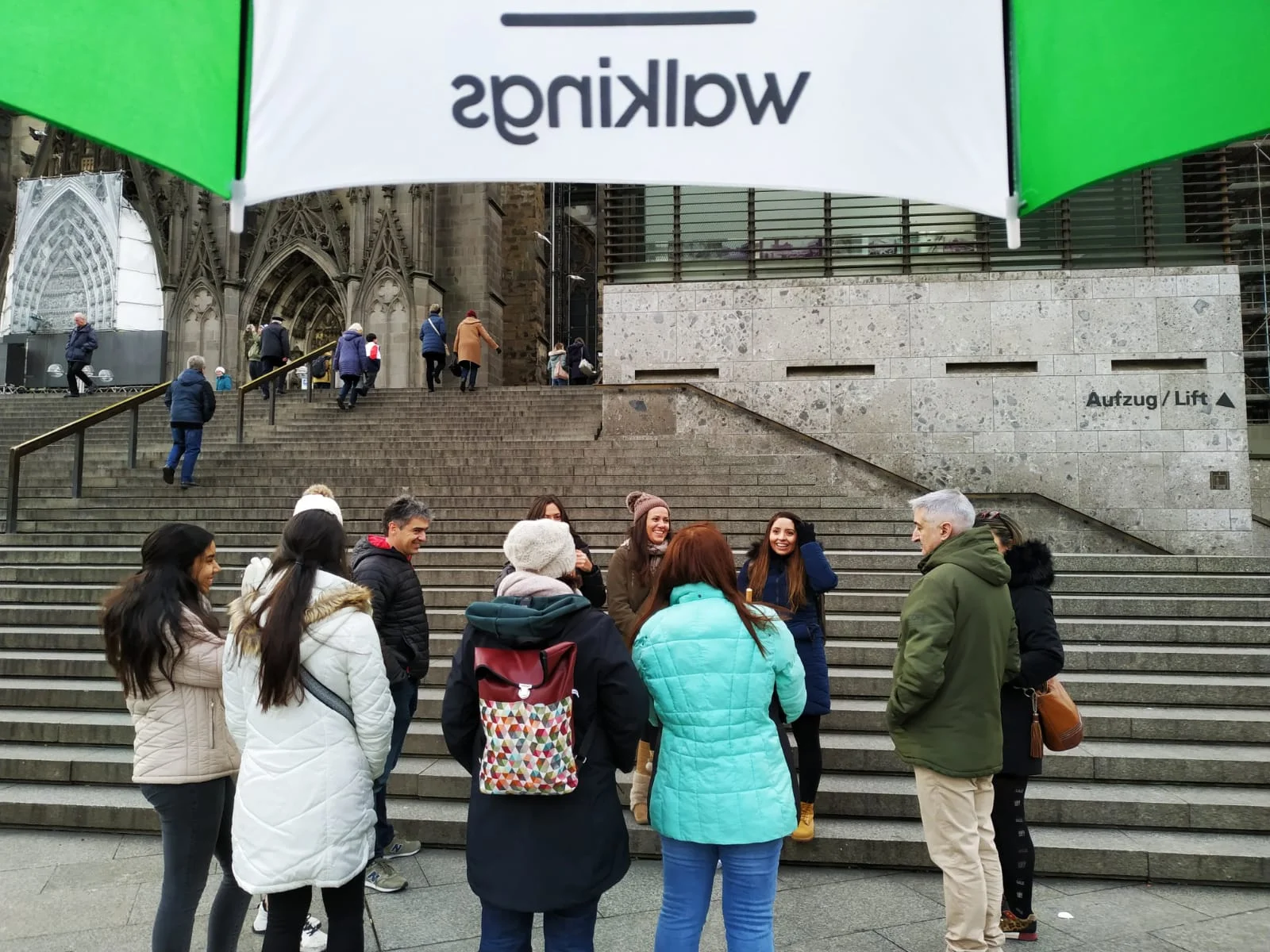 Wir erwarten Sie am Bahnhofsvorplatz (Sie finden ihn auf Google Maps), unten an der Treppe links vom Kölner Dom, wenn Sie den Hauptbahnhof verlassen. Sie sollten die Aufschrift „Hauptbahnhof“ in großen Buchstaben über der Glaswand sehen können 🚄. Die Guides warten üblicherweise ganz in der Nähe des Cafés/der Bäckerei Kamps. Wir tragen einen grün-weißen Regenschirm, Sie können uns also nicht verfehlen. Bitte verwechseln Sie dies nicht mit dem Haupteingang des Doms (ein häufiger Fehler, aber es ist nicht der richtige Ort 😉).