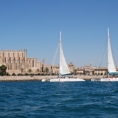 Emprende un viaje en velero desde el puerto de Palma de Mallorca a bordo del catamarán MAGIC por la Bahía de Palma hasta Cala Vella.