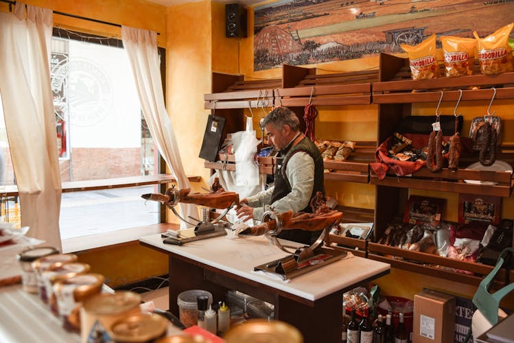 Finalmente, continúa hacia una tradicional tienda de abarrotes "ultramarinos", donde disfrutarás de un merecido aperitivo. Relájate con tu vino dulce local o vermú español en la mano y disfruta del ambiente. Aquí probarás algunos de los mejores productos de la ciudad: jamón ibérico, salchichón ibérico, morcilla y queso manchego. Un final delicioso para un recorrido gastronómico perfecto.