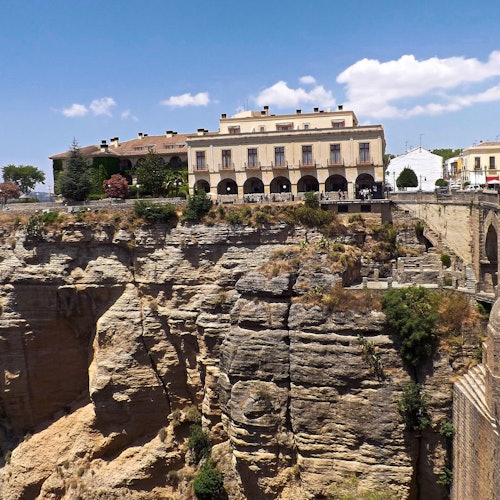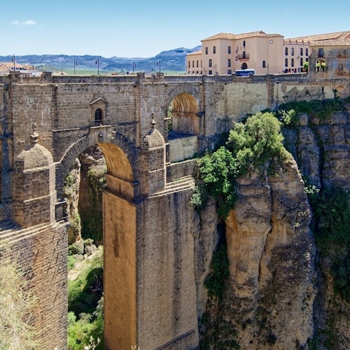 El viaje continúa hacia la ciudad de Ronda con cuatro horas de tiempo de descubrimiento. Deléitate con las impresionantes vistas desde el Puente Nuevo, a horcajadas sobre el río Tajo, y adéntrate en la rica historia del casco antiguo, sus cautivadores museos y la grandiosa catedral.