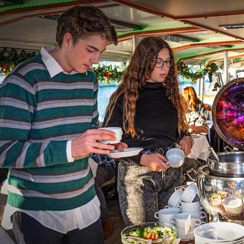 Mientras te empapas de las vistas, deléitate con exquisiteces como esponjosos huevos revueltos, aromáticas mermeladas caseras y sabroso paté de hígado de pollo con frescos "panecillos Kaiser". Mientras te das un capricho, la grandeza del edificio del Parlamento húngaro te roba una mirada, dejando embelesados a los espectadores. Y no olvidemos la opción de prosecco sin fondo (si se elige), el acompañamiento perfecto para tu opípara comida.