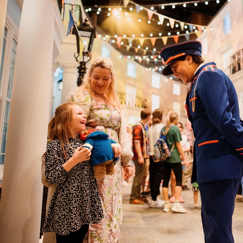 - Entra en el County Hall desde la orilla del río y busca las banderas de La Experiencia del Oso Paddington™. Una vez en el edificio, busca la tienda de antigüedades Gruber's y accede a la experiencia desde allí.