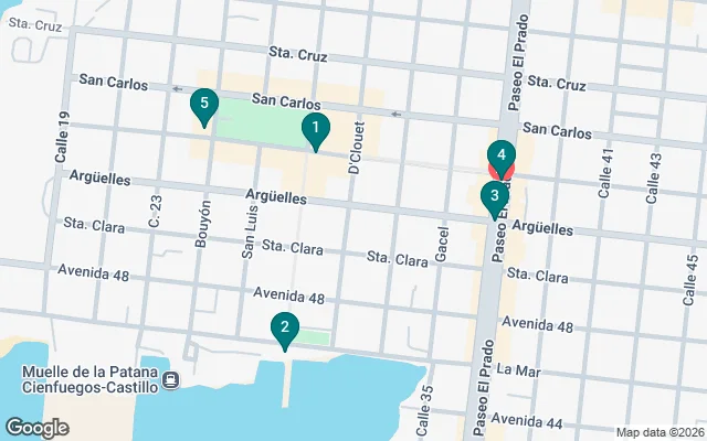 Es el punto de encuentro y donde comienza el tour. Allí conocerán sobre Benny Moré y su importancia para la cultura y la música cubana y de a Cienfuegos. Se les explicara a los walkers sobre el Paseo del Prado y su impresionante importancia para el desarrollo urbano de la ciudad.