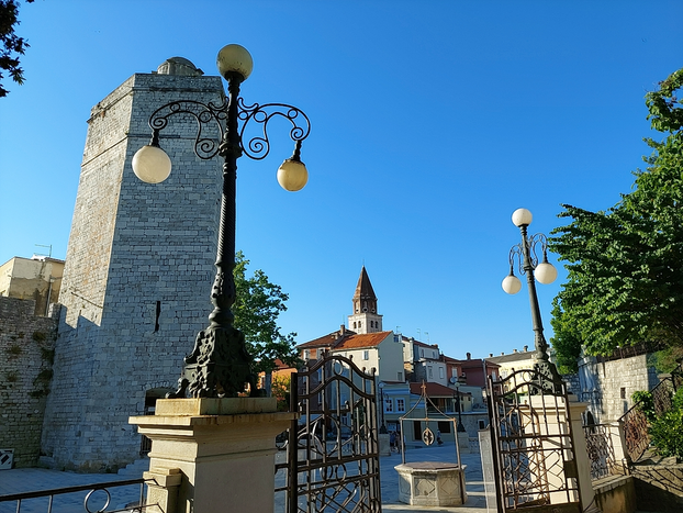 Comenzamos el recorrido en la Plaza del Pueblo, bajo una hermosa torre del reloj en un edificio del siglo XVI, donde la gente de Zadar