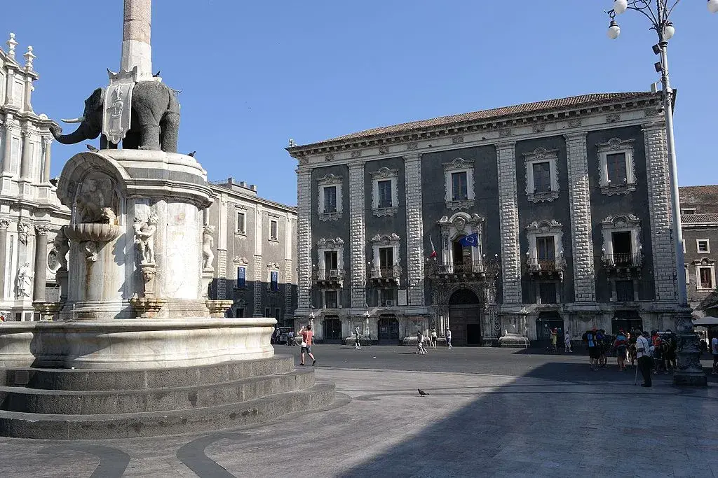 Estaré debajo del elefante en la Piazza del Duomo con una insignia roja (licencia de guía turístico para la región de Sicilia)