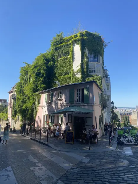 De repente siguió su viaje y se detuvo en los viñedos de Montmartre, donde la vimos arrancar un ramito de vid. Con él en el pico, voló desde el cabaret Lapin Agile hasta la Maison Rose, haciéndonos recordar el famoso cuadro de Picasso y su paloma de la paz...