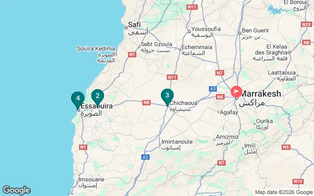 Sal de Marrakech por la mañana y dirígete a la hermosa Essaouira en la costa atlántica. Una vez que llegue a la ciudad portuaria, anteriormente conocida como Mogador, tendrá tiempo para disfrutar de las encantadoras vistas de Essaouira.