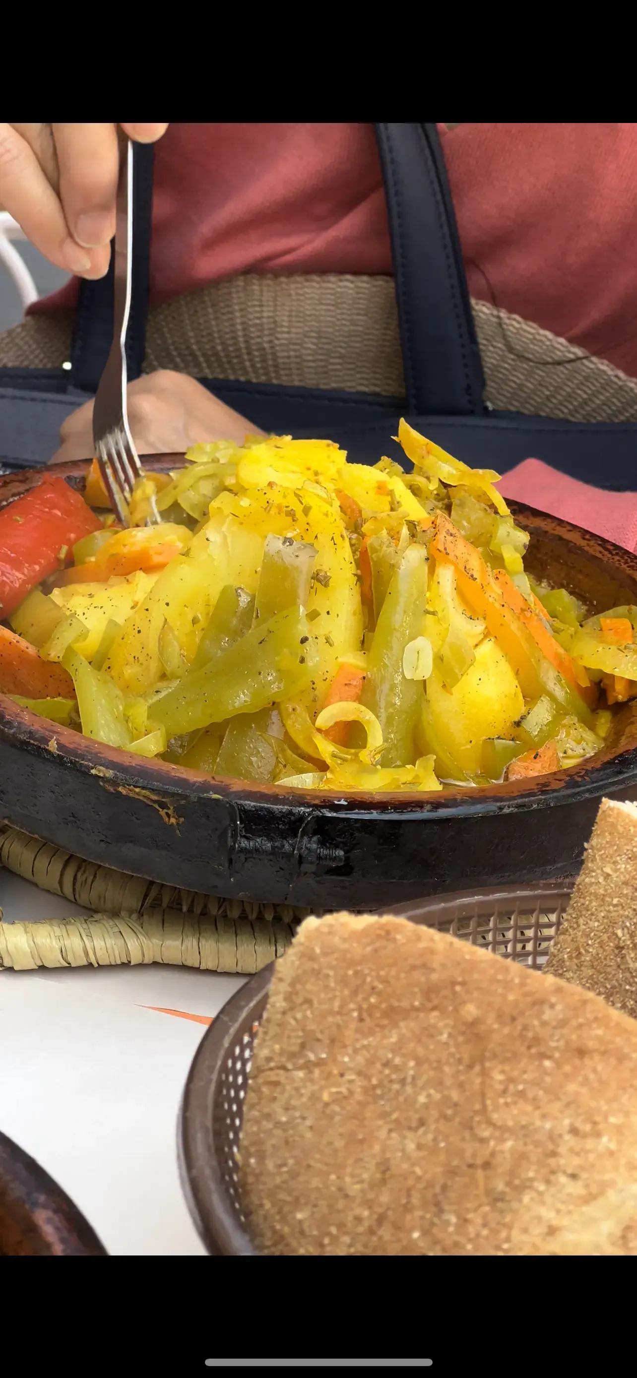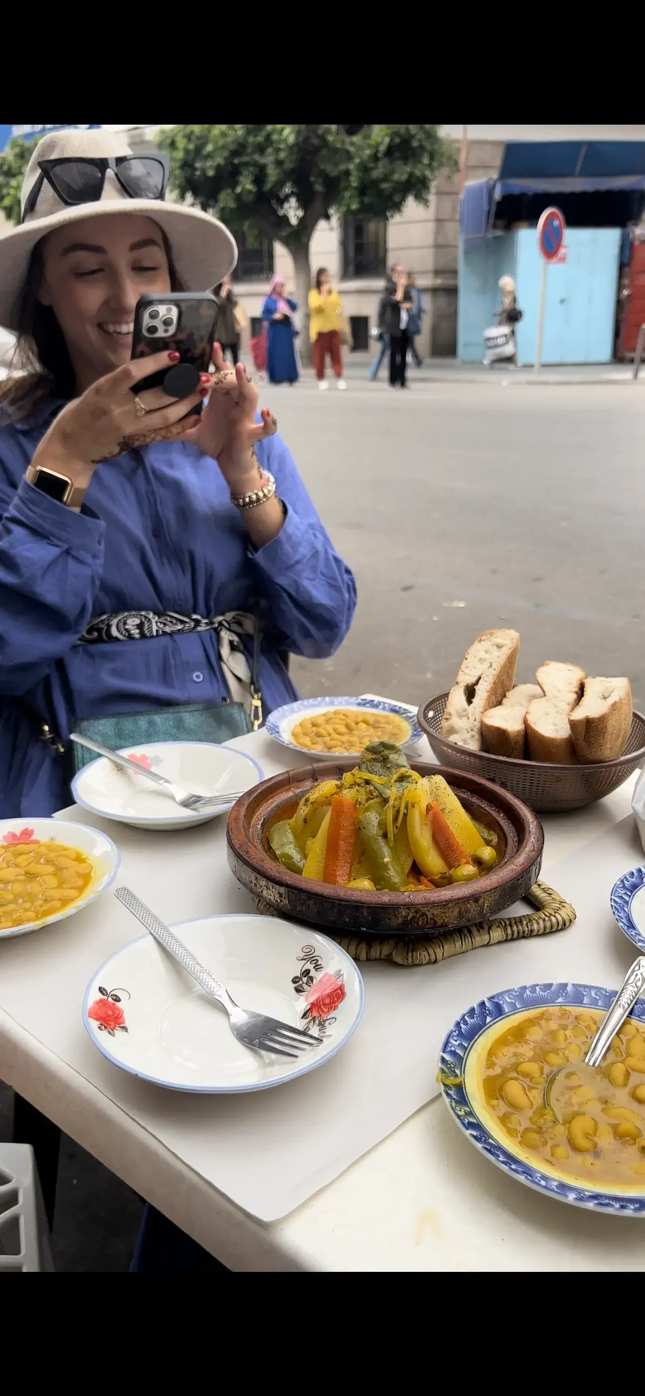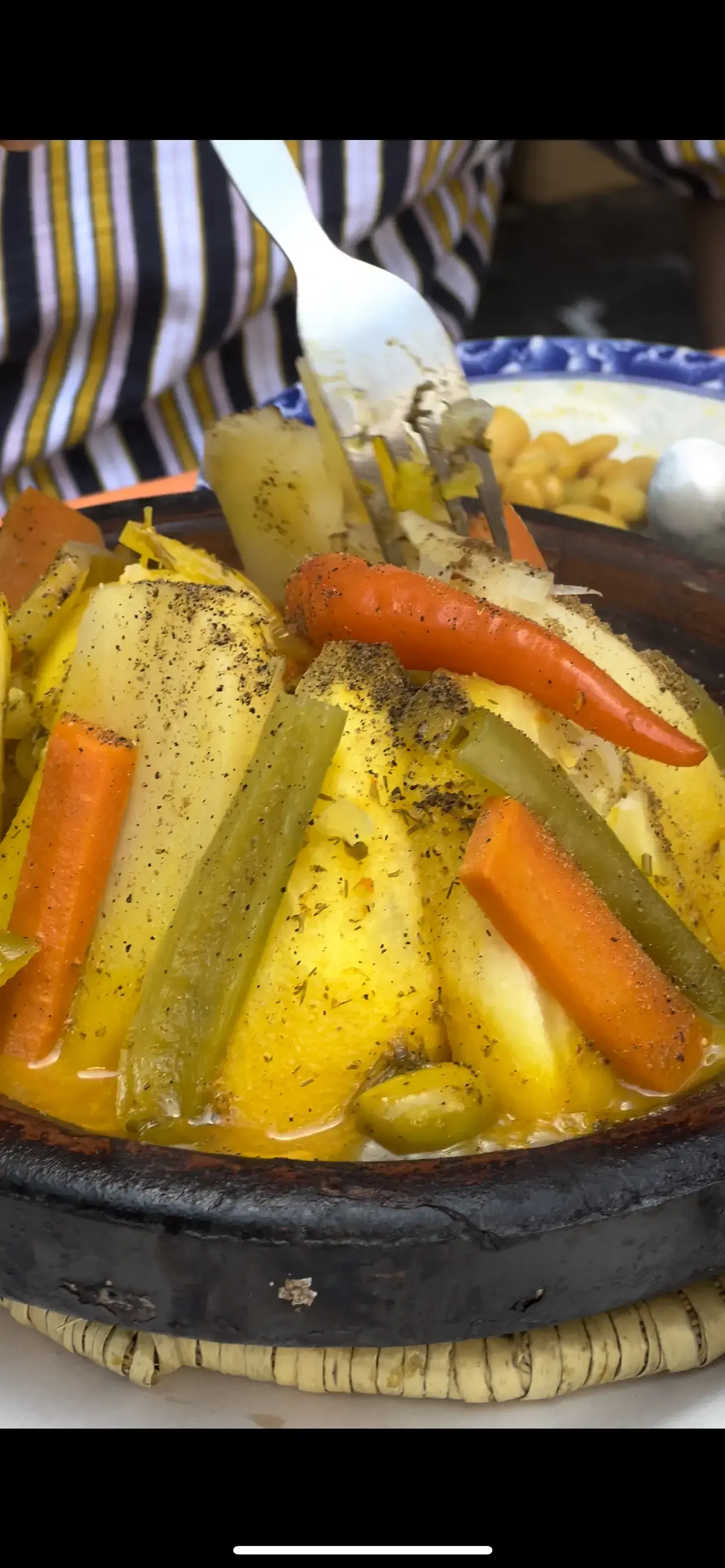 Luego, caminamos unos 5 minutos hasta el lugar de comida principal. Tendremos la comida marroquí más icónica que es rica en especias marroquíes en Tagine (Verduras con pollo o carne de res)