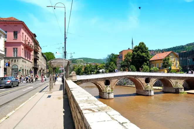 ➡️ Terminaremos nuestro recorrido en el lugar del puente latino, un puente otomano que conduce al barrio Latinluk en el que en la época otomana vivían los cristianos. Cerca de este puente hay un lugar donde Gavrilo Princip mató al archiduque Franz Ferdinand y su esposa, que fue una de las principales razones para comenzar la Primera Guerra Mundial.