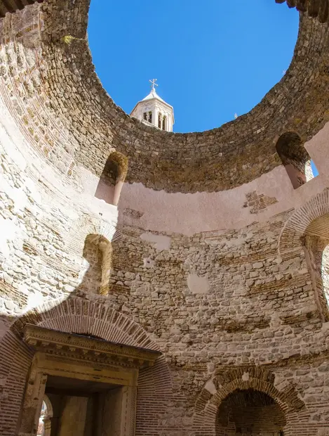 Visitaremos diferentes zonas del complejo, como las bodegas y el monumental patio del Peristilo . Admiraremos el observatorio privado del emperador y la Catedral de San Duje , construida originalmente como Mausoleo de Diocleciano. Descubriremos el sitio del Templo de Júpiter y el Baptisterio , así como las originales Puertas de Bronce, Plata, Dorada y Hierro que daban acceso a la ciudad. Descubramos un refugio para las nobles de Split en el Monasterio Benedictino de San Arnir , admiremos el Ayuntamiento original del siglo XV y maravíllese con los monumentos barrocos de la Plaza de las Frutas (Voćni trg).