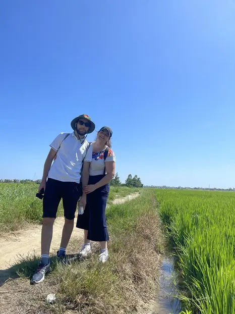 Súbete a una bicicleta y descubriremos la vida cotidiana de la gente local en Hoi An. Lejos del centro turístico del casco antiguo, pedalearemos por una carretera estrecha y pintoresca a través de campos de arroz . Saluda a los búfalos y comprende el proceso de cultivo del arroz , siendo testigo de cómo crece en los campos húmedos. Pase por el pueblo de vegetales Tra Que, de 300 años de antigüedad, donde se sorprenderá con la variedad de hierbas y verduras, y aprenderá los secretos para una vida larga y saludable.