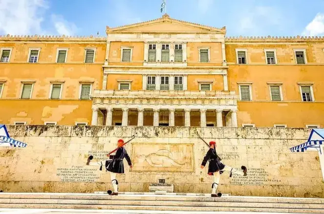 · El Monumento Art Déco al Soldado Desconocido , frente al Parlamento griego. Esta tumba de mármol conmemora a quienes murieron por la libertad. Cada hora, el emblemático cambio de guardia rinde homenaje a los caídos, las 24 horas del día, los 7 días de la semana.