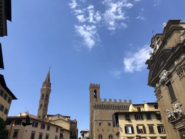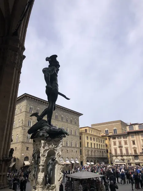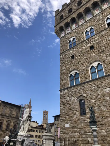 Piazza della Signoria y las magníficas esculturas de la Loggia dei Lanzi Y luego el Lungarno, el Ponte Vecchio, el Palazzo Pitti, torres medievales y edificios llenos de encanto e historia.