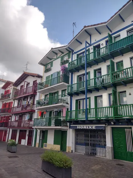 Plaza con arquitectura representativa vasca y nueva construcción.