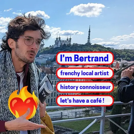 ¡Hola! Soy Bertrand, un actor y artista visual francés, nacido y criado en Lyon. También soy un apasionado guía y narrador profesional, y he diseñado este viaje para sumergirte en la rica historia de Lyon. Permíteme compartir contigo los secretos y tesoros de la ciudad, ¡todo desde una perspectiva francesa y divertida!