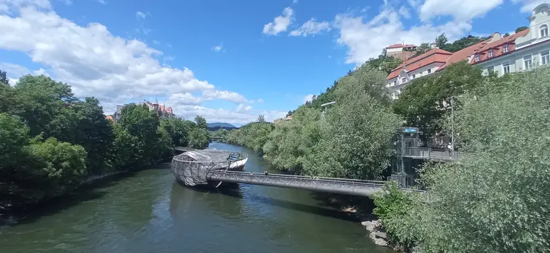 Punto de encuentro: 8020 Graz, Lendkai 1, frente a la entrada de la Kunsthaus, en el exterior, cerca de la escultura modelo.