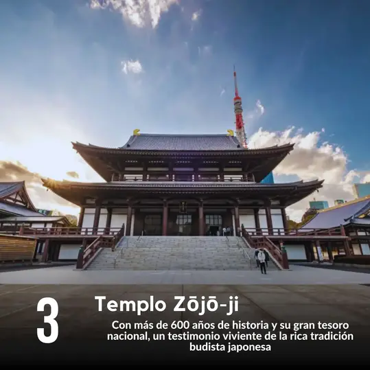 🔵 Templo Zojoji: Admira la belleza de este templo budista, uno de los más importantes de Tokio, con un tesoro nacional y mausoleo de la familia Tokugawa.