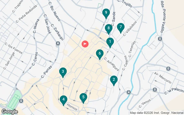 Partimos de la majestuosa Plaza Mayor, corazón vibrante de la ciudad, para adentrarnos en la elegante calle Gran Vía. Desde allí llegamos a la tranquila Plaza de San Juan y seguimos por la histórica calle Pizarro hasta la Plaza de las Claras. Atravesamos la Puerta Sur y paseamos por la pintoresca calle Pereros, llegando al evocador Olivar de la Judería. Nos perdemos por el Callejón del Moral, cruzamos la Puerta Este y caminamos por la calle del Cristo. Entre sombras y susurros pasamos por el Callejón de la Amargura, emergiendo en la monumental Plaza de Santa María. Avanzamos por la calle Tiendas hacia la Puerta Norte, descendemos la Cuesta del Maestre y nos detenemos en la Plaza de Santiago y la Plaza de la Audiencia. Por la calle Muñoz Chaves regresamos, cerrando el círculo en la inigualable Plaza Mayor.