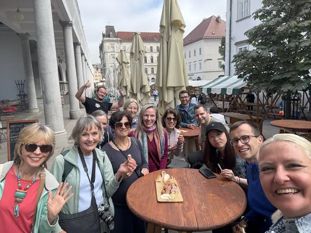 Durante el recorrido, exploraremos la Plaza Prešeren, la Plaza del Congreso, el Puente de los Zapateros, la Plaza Vieja, la Plaza del Pueblo y la Fuente Robba, y el Mercado Central. Escucharás historias que incluso los lugareños rara vez comparten, conocerás a artesanos y vendedores, y experimentarás el vibrante ritmo de la ciudad, todo ello mientras disfrutas de auténticos sabores eslovenos.