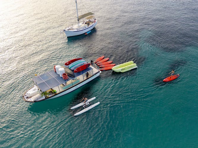 La aventura no termina en el barco. También puede zambullirse en el mar con las bicicletas acuáticas, el equipo de snorkel y las tablas de paddle surf, todo incluido. Descubra cuevas costeras ocultas y aprecie el mundo submarino de Ibiza mientras el cielo se transforma en un lienzo de colores asombrosos.