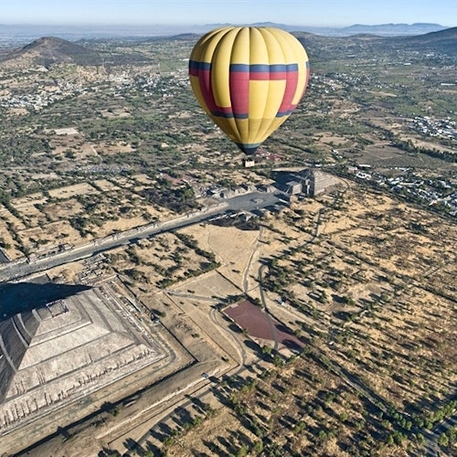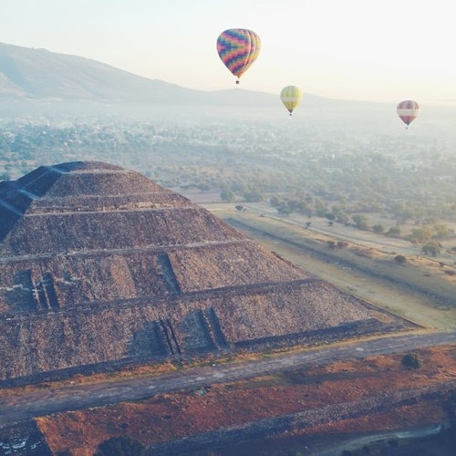 A primera hora de la mañana viajarás cómodamente a Teotihuacán desde un punto de encuentro conveniente. Una vez allí, después de una breve presentación e instrucciones, ¡estarás a punto de elevarte por los aires en un globo aerostático!