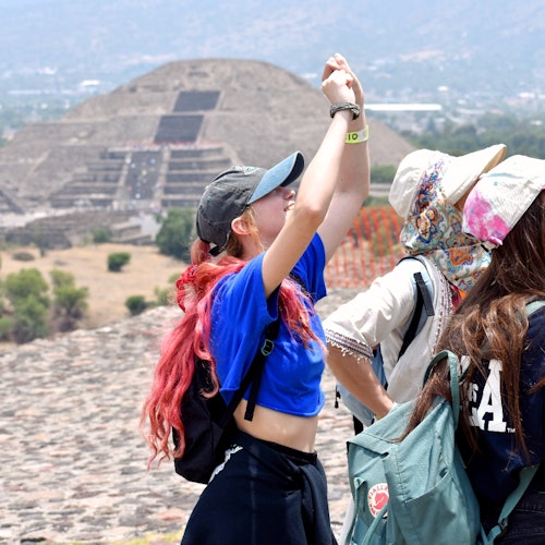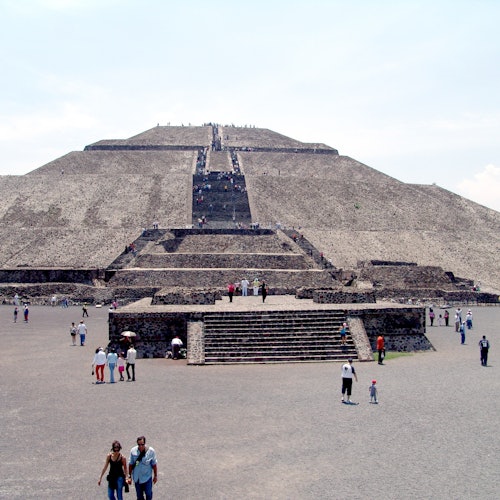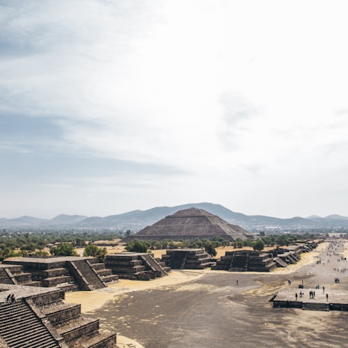 Después del vuelo, saca el aventurero que llevas dentro y explora la zona arqueológica de Teotihuacán a nivel del suelo, donde verás las monumentales pirámides del Sol y la Luna, la Avenida de los Muertos y el Templo de Quetzalpapalotl.