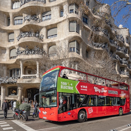 Haz un recorrido en autobús turístico para una visita flexible a Barcelona. Viaja en un autobús de dos pisos por la ciudad y haz fotos de lugares notables.