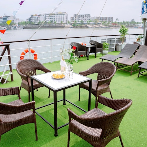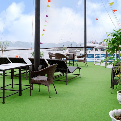 Regresa al barco para disfrutar de una fiesta al atardecer con vino, frutas y galletas mientras el barco navega de regreso al puerto. Llega de nuevo al puerto de Tuan Chau.