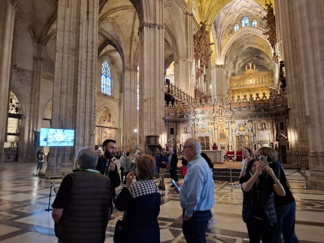 Embárquese en una visita guiada por el patrimonio real de Sevilla, donde explorará el conjunto monumental del Real Alcázar, la majestuosa Catedral de Sevilla (Santa María de la Sede) y la emblemática Giralda.