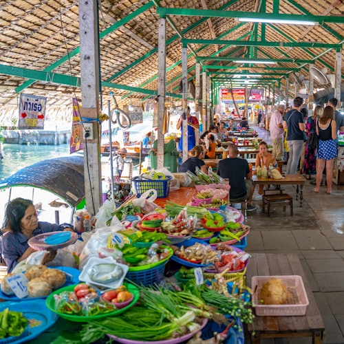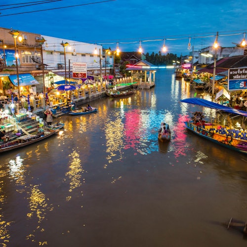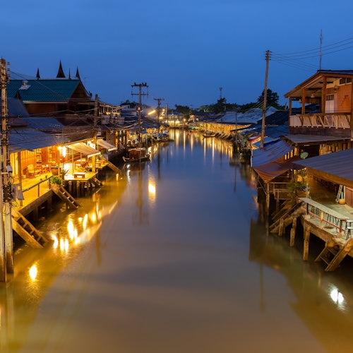 Situado en el Canal de Amphawa, el Mercado Flotante de Amphawa es uno de los mercados flotantes más populares de Tailandia. Visita este centro ribereño y contempla a los vendedores de deliciosos manjares como dulces y marisco. Después, al atardecer, cuando las luces se hayan atenuado, relájate con un crucero por el río rodeado de luciérnagas parpadeantes.