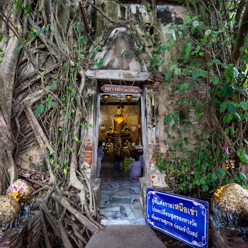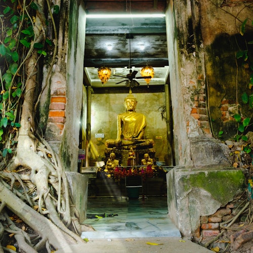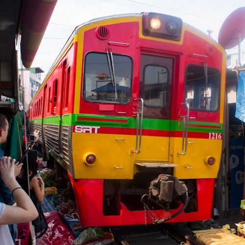 El Mercado del Tren de Maeklong es un mercado fresco situado junto a una vía férrea trillada. Observa cómo los vendedores cierran y abren expertamente sus toldos para hacer sitio mientras los trenes pasan traqueteando Conoce la sangrienta historia de batallas de la zona y contempla el Buda de Oro en el interior de Wat Bang Kung, un impresionante templo budista engullido por las raíces de un enorme árbol baniano.