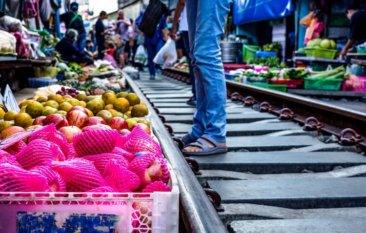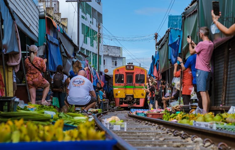 El mercado se asienta sobre la vía del tren, y los clientes y tenderos dejan paso al tren Bangkok-Maeklong todos los días. Al sonar una campana de advertencia seguida de un anuncio en tailandés por megafonía, los vendedores retiran sus toldos en cuestión de segundos.