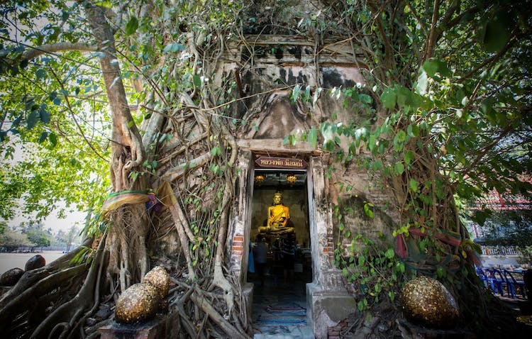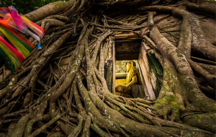 - Visite un antiguo templo donde los troncos de los árboles envuelven una sala budista con estatuas de Buda en el vestíbulo