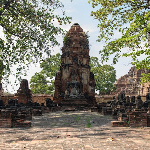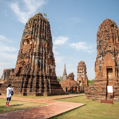 En Ayutthaya, explora fascinantes lugares religiosos antiguos, como Wat Mahathat, donde una cabeza de Buda decapitada se encuentra entre antiguas raíces de árboles. En Wat Mongkol Borpit, asómbrate ante la enorme estatua de Buda sentado, y luego explora el complejo más sagrado e importante de la antigua capital tailandesa, Wat Phra Sri Sanphet.