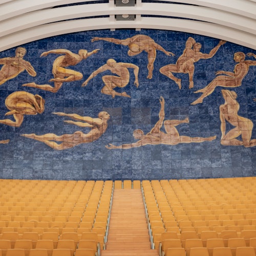 Únete a una visita guiada que comienza en la plataforma de acceso al edificio, donde las taquillas marcan el inicio.