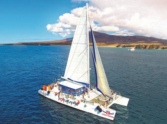 Tras la recogida, se dirigirá a Puerto del Carmen para subirse a un catamarán. Saboree su mojito mientras nos deslizamos a lo largo de una costa con una columna vertebral de más de una docena de volcanes silueteados contra el horizonte: un panorama único. También podrá picar sabrosos canapés y disfrutar de una cerveza, sangría o refresco de cortesía.