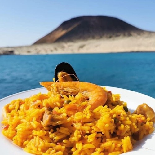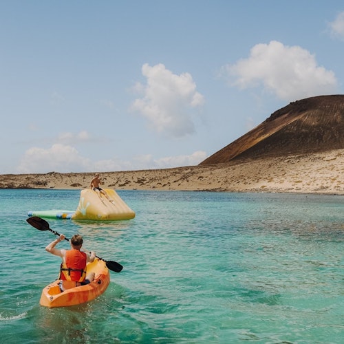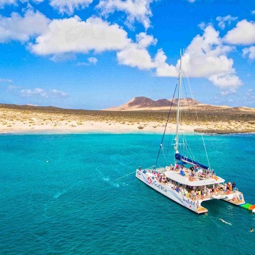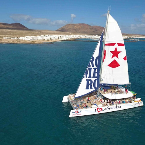 En el muelle, sube a bordo de un catamarán y navega por la costa sur de La Graciosa. Contempla las vistas de Lanzarote y fondea cerca de Playa Francesa.